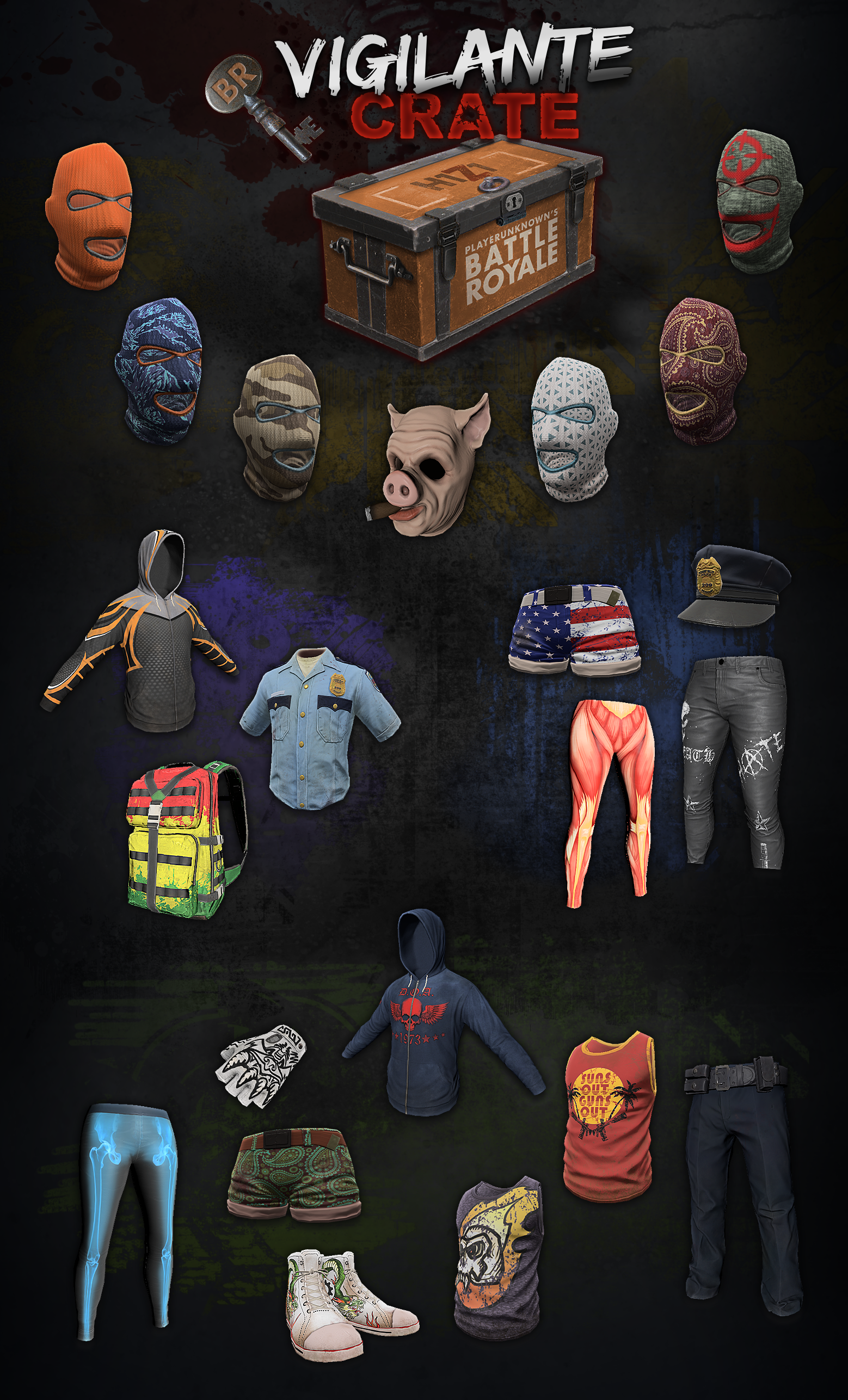 Out with the old, in with the AWESOME new masks! It’s time for the previous Battle Royale crate to be retired, and in its place, we’re introducing the new Vigilante Crate. The Vigilante Crate includes Police-themed gear, Stars and Stripes shorts, hoodies, a rasta backpack, and much more!