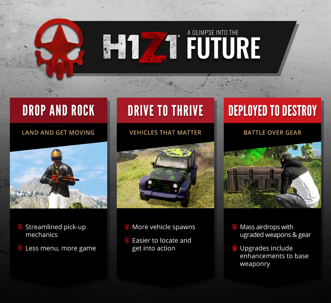 With the launch of the Combat Update this week, we’re excited to bring you a glimpse into the future roadmap of H1Z1. Your feedback was hugely instrumental in helping shape the combat update, and now that it’s live, we want to share our vision with you as we take the next steps toward redefining what it means to play H1Z1.