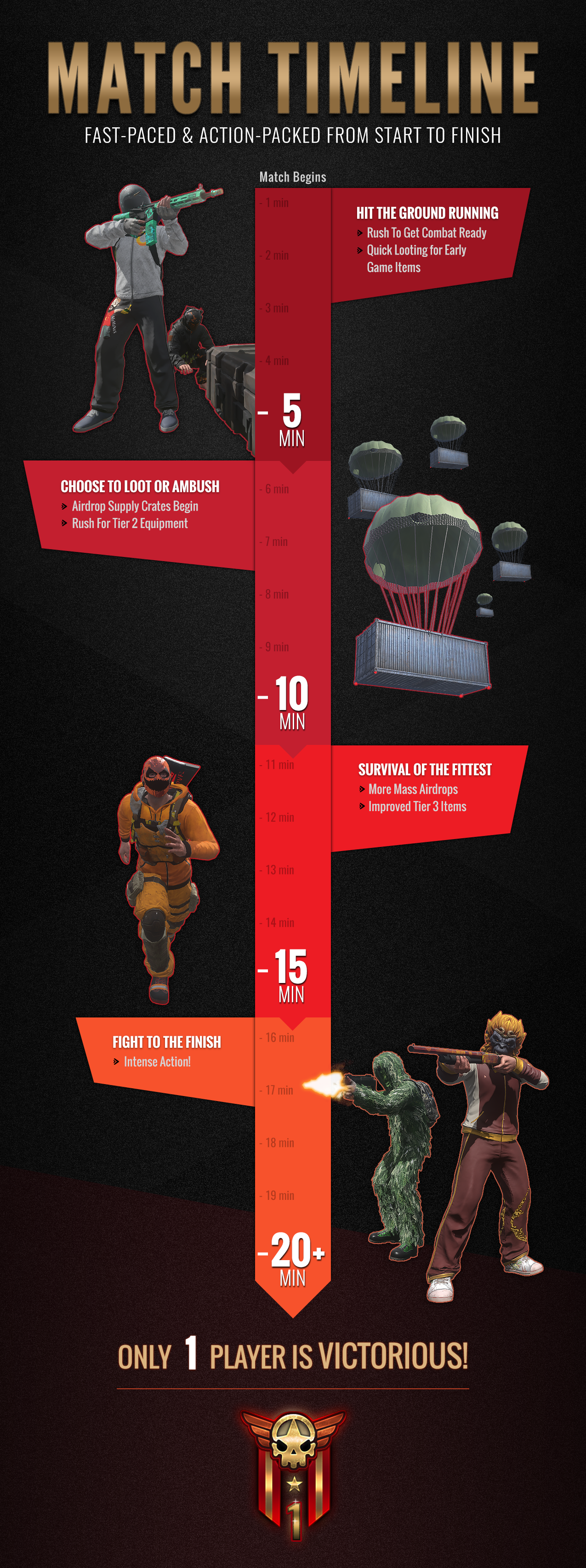 Based on these core gameplay principles, here’s how we envision a typical match of H1Z1 would play out: As the match starts to ramp up, multiple supply crates are airdropped into the arena at the same time. These airdropped crates are loaded with upgraded variants of the weapons found around the arena to give you an edge over the competition. You’ve got a choice: Get aggressive and hit these airdrops before your opponents, or try to outmaneuver your opponents and let them make the first move. Supplies will airdrop in waves with more powerful weapons coming in as the game goes on. Action in the end-game is intense, so you’ll build up your arsenal from airdrops and downed players if you want to be the last one standing.