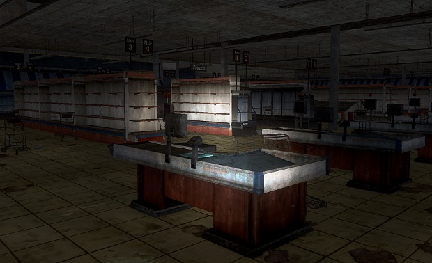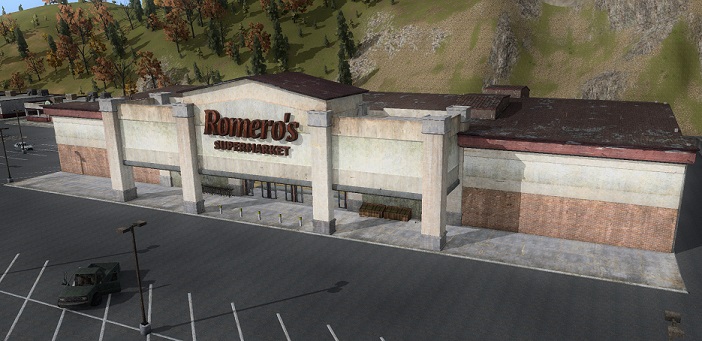 -Then we need other places to drive to. The big box store Supermarket was a challenge because I rarely make structures. But it was relatively straightforward. The main issue involved a store load of props that flesh out such a building. A seemingly never-ending variety of shelves and signs and scales and meat cutters fill out the interior. However, I am amused that they accepted my name suggestion for the store. The store itself is a kind of fortress refuge from the storm, if you can clear out the zombies or bears.
