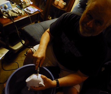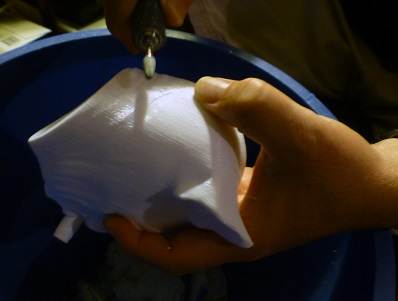 I decided to sand down each trophy with some heavy and light grit sandpaper. Then I needed to get into the crevices and get out filaments and sprue and other bumps. So I borrowed my Dental Tech wife’s hi-whizz-bang Dental Hand tool to grind those places out. My plan was to coat the trophy in Gesso once I had a cleaned up base—Gesso is a pasty paint like substance that is thick and clings to things well, and can be sanded.