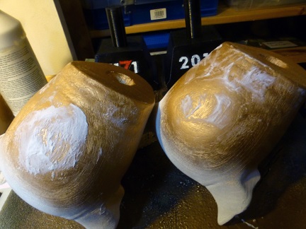 Back to the heads! These now needed refining, sanding, and filling. I did a quick spray of Gold metallic Krylon paint to see how it was gripping the surface, and that allowed me to see where I need to fill more with putty. So some quick setting putty went on and that was sanded down again.