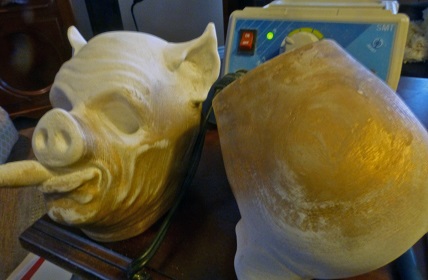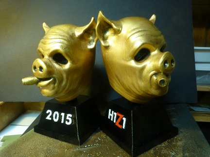Newcomer to the H1Z1 team, Senior Character Artist Kacey Helms, turned “Zimm’s” original Mask 3D art into a design for the trophy and base. Senior Software Engineer Grat Crabtree (but more famously known for Grat’s Refried Beans and Chili) offered to take the 3D mesh of the pig mask and render it on a stand with his 3D printer. He brought in a rough test of it, and then it was green-lit—which just means we all decided that it was a good idea and started on the task.