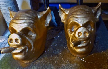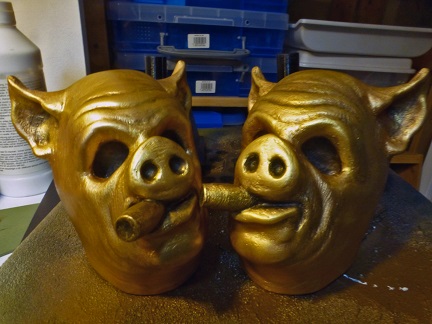 Another coat of paint, then I added some dark spaces to help define the mask look. One more coat of paint, some more shadows. I then mixed up a batch of my super shiny Gold acrylic paint and with a big brush went over the models so this shiny gold would hit the highlights. Once that was dry, I buffed them with a soft cloth to make the trophies as smooth as possible.