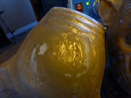 I documented the process with some photos, to remember the before and after. The first photos reveal the issues on the back side where there were cracks and where the striation patterns mesh up the aesthetic of the front details. I had tested some new gold spray paint on the test sample provide by Grat, and that was good to go, and I knew Acrylic Hobby paints would work fine. But how was I going to make these surfaces work for me and end up with a pleasant result? Elbow grease was the only solution!