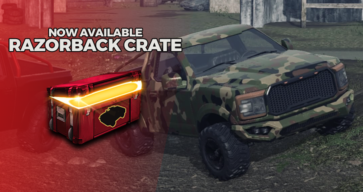 Soup up your new ride with up to 8 sweet styles in the new Razorback Crate! Each Crate purchase offers a 1 in 20 chance to hit Jackpot, which will unlock ALL 8 crate skins PLUS the bonus Jet Black Razorback!