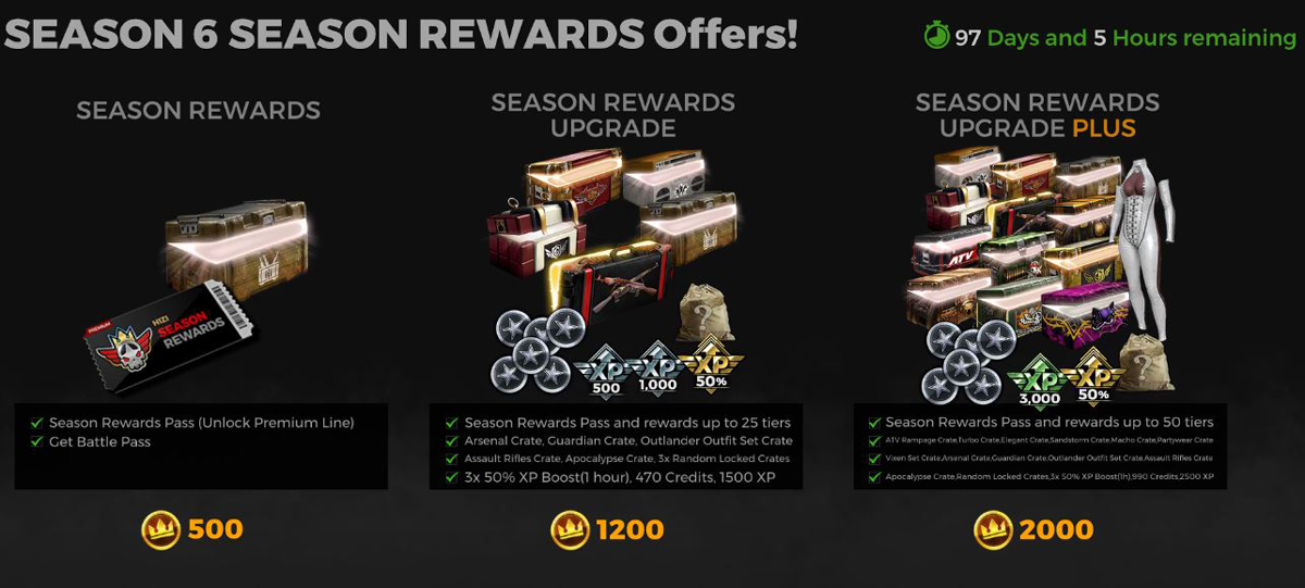 - Season Rewards Premium + 50 Tiers Unlocked (2000 Crowns): Unlocks ATV Rampage Crate, Turbo Crate, Elegant Crate, Sandstorm Crate, Macho Crate, Partywear Crate, Vixen Outfit Set, Arsenal Crate, Guardian Crate, Outlander Outfit Set, Assault Rifles Crate, Apocalypse Crate, 3x Random Locked Crates, 3x 50% XP Boost (1 hour), 990 Credits, 2500 XP