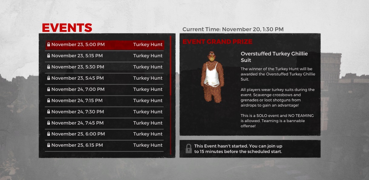 The Turket Hunt is an Event, so in order to find it you’ll click Play and then at the bottom of the list you’ll see the Events button. From there you’ll see a list of all the times the Turkey Hunt Events are kicking off in your region. The event will be available starting on November 22nd and will run through November 26th.
